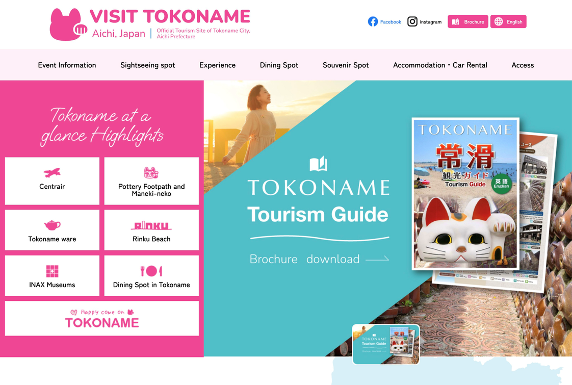 このたび(一社)とこなめ観光協会では、中部国際空港セントレアを発着する国際線の復活を受け、今後の更なるインバウンド誘致に向けて常滑市公式観光サイト「とこなめ観光ナビ」に多言語観光ウェブサイト「VISIT TOKONAME」を併設し、外国への情報発信力を大幅に強化します。