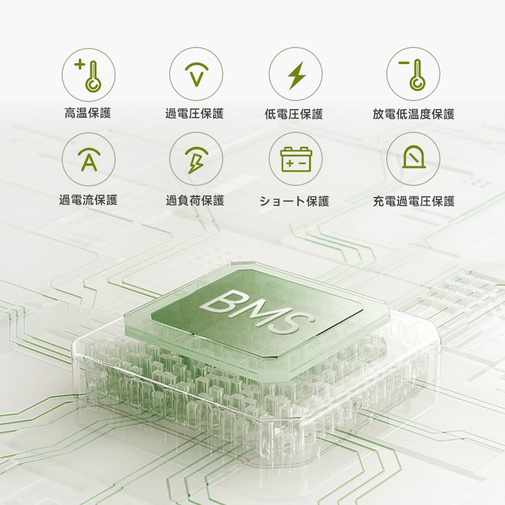 R600ポータブル電源は600℃まで熱分解が起こらない、安全面においては最高クラスのLiFePO4リン酸鉄リチウムイオン電池を採用し、弊社独自開発の技術により3500回(80%)、6500回(50%)のライフサイクル数を実現。また、最先端BMSバッテリー管理システム(9つの保護機能搭載)にて毎日使用しても約17年以上安心・安全にご使用いただけます。