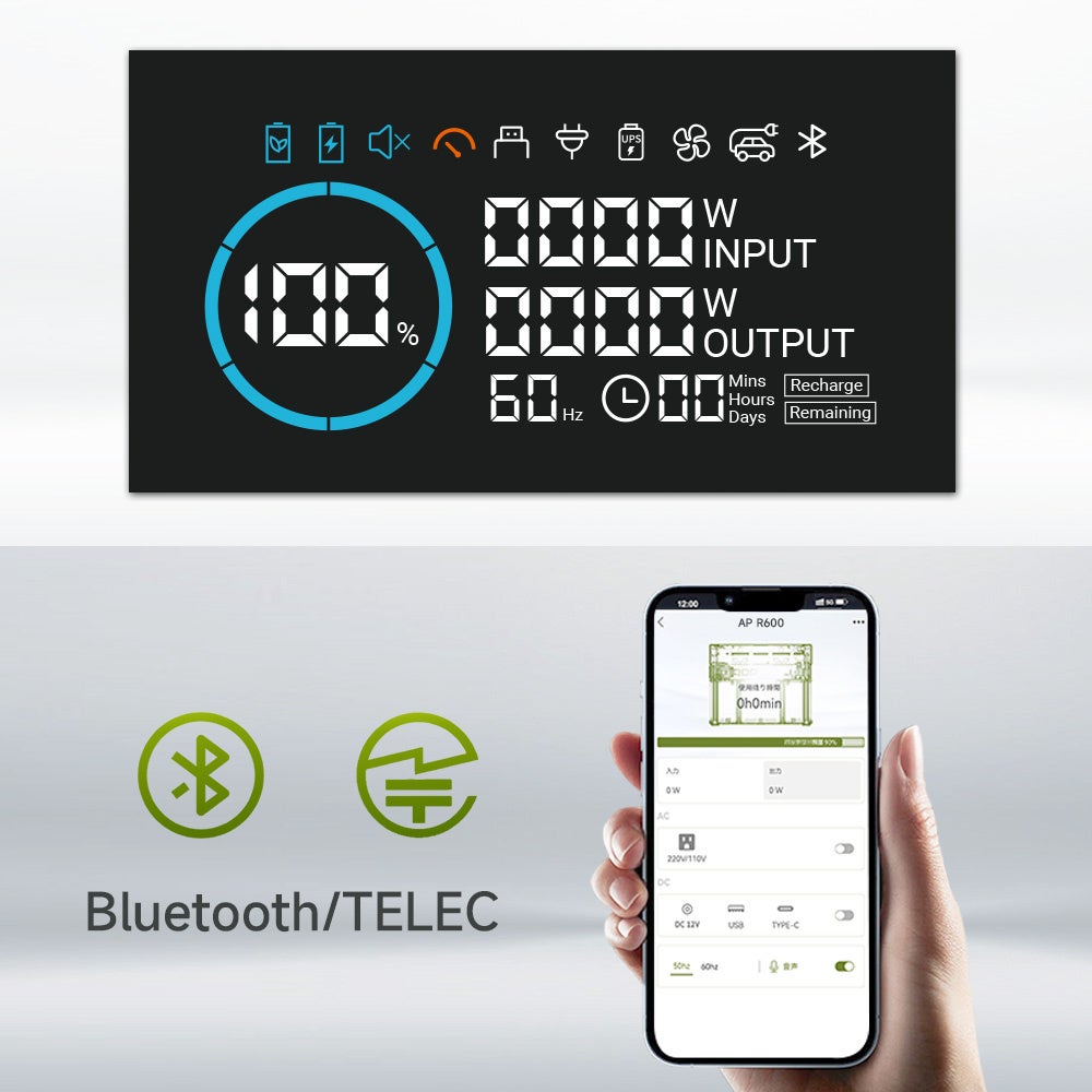 ALLPOWERS R600 ポータブル蓄電池はボタン操作のほか、ALLPOWERS専用アプリからポータブル電源R600を簡単にリモート操作できます。操作可能機能:①バッテリー残量、入力電力、出力電力及び目安の利用可能時間などの情報を確認、②AC・DC・USB出力のオン/オフ、③LEDライトをつけ/消す、④周波数切替、⑤充電モードの切替、⑥エコモードの時間設定など。