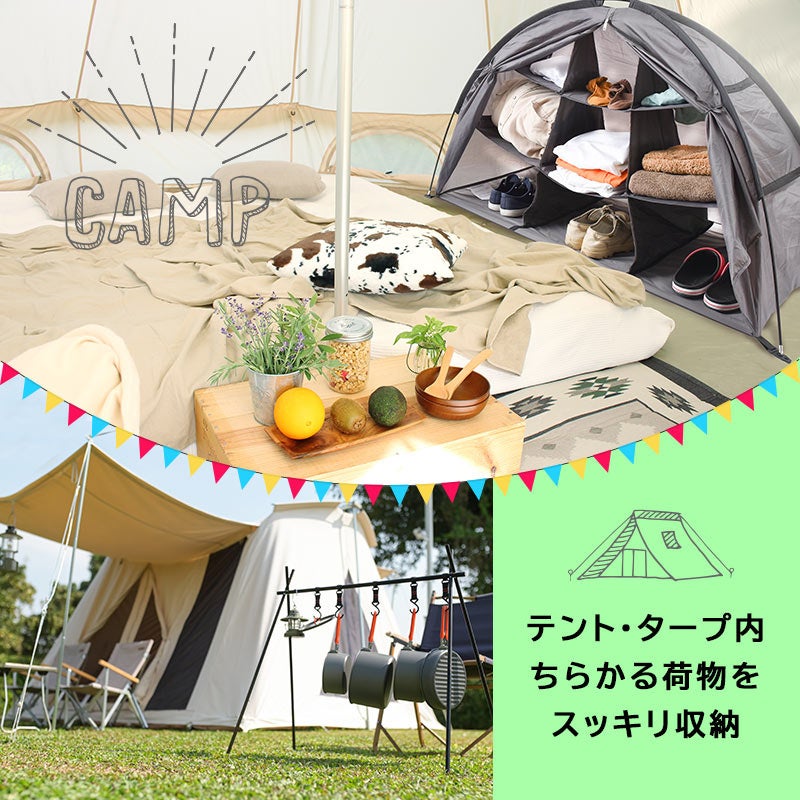 本製品はキャンプの際に衣類や靴などが置けるテント型の棚です。