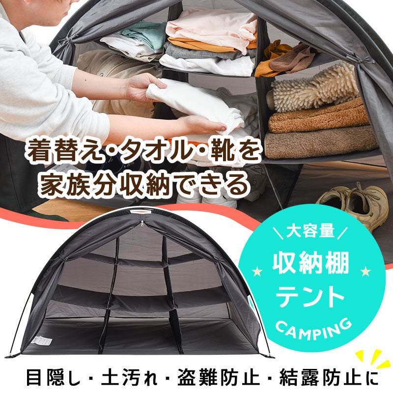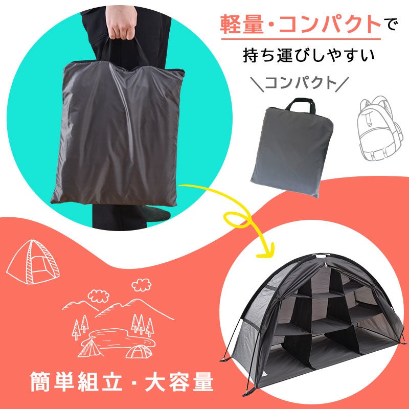 本製品はキャンプの際に衣類や靴などが置けるテント型の棚です。