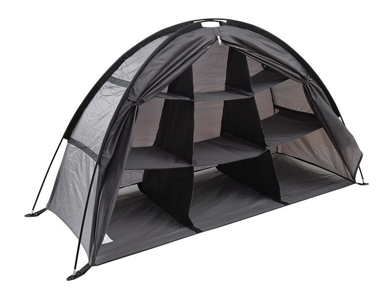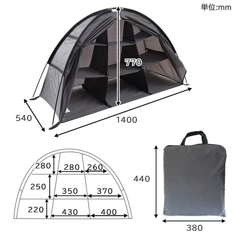 本体重量1kg。通常のテントのように2本のポールを通して組み立てるタイプ。サイズは完成時幅140×奥行54×高さ77cm。折りたたみ時は幅44×奥行38×厚さ4cm。組み立てると高さ3段の棚×横に3段の9個の棚が出来上がります。耐荷重は各棚1kg。前面のチャックでフルクローズにもできます。下段に靴、中段にタオルや衣類、上段には靴下などをきれいに収納することが可能。タープの下で盗難防止、結露防止などにも有効です。