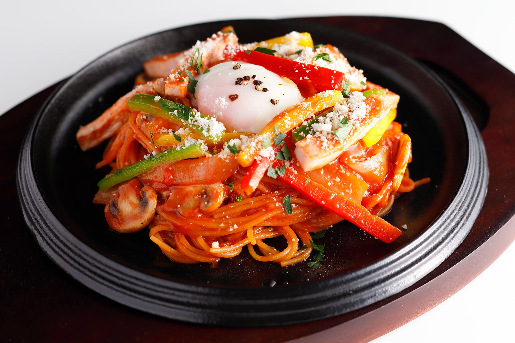 洋食の王道人気メニュー「ナポリタン」は、特製トマトソースに、*黄エンドウ豆100%の軽やかなZENBヌードルを絡め、食感豊かなパプリカとトロっと濃厚な温泉卵をトッピング。アツアツの鉄板焼スタイルで香ばしく提供します。