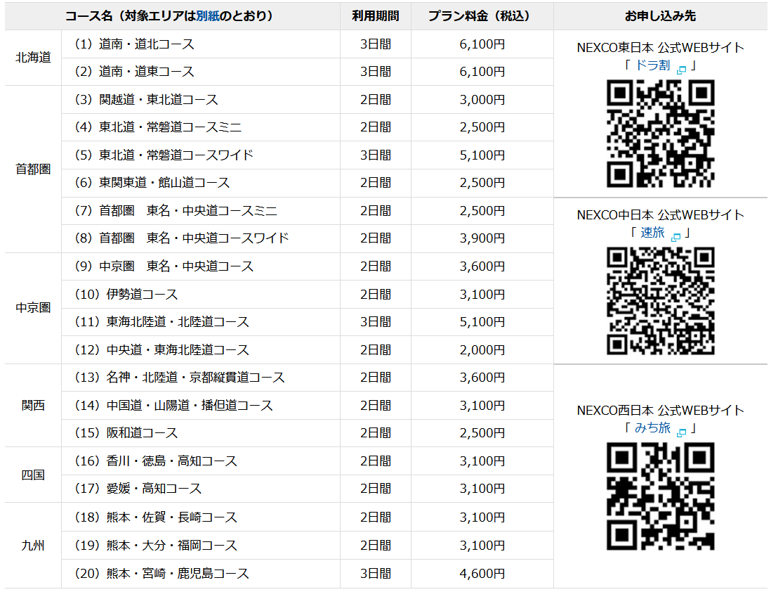 ・ ご利用になる日時や区間によっては、通常料金またはETC時間帯割引が適用された料金の方が安価な場合があります。事前にNEXCO各社の公式WEBサイトなどで利用予定経路の料金をご確認のうえご利用ください。