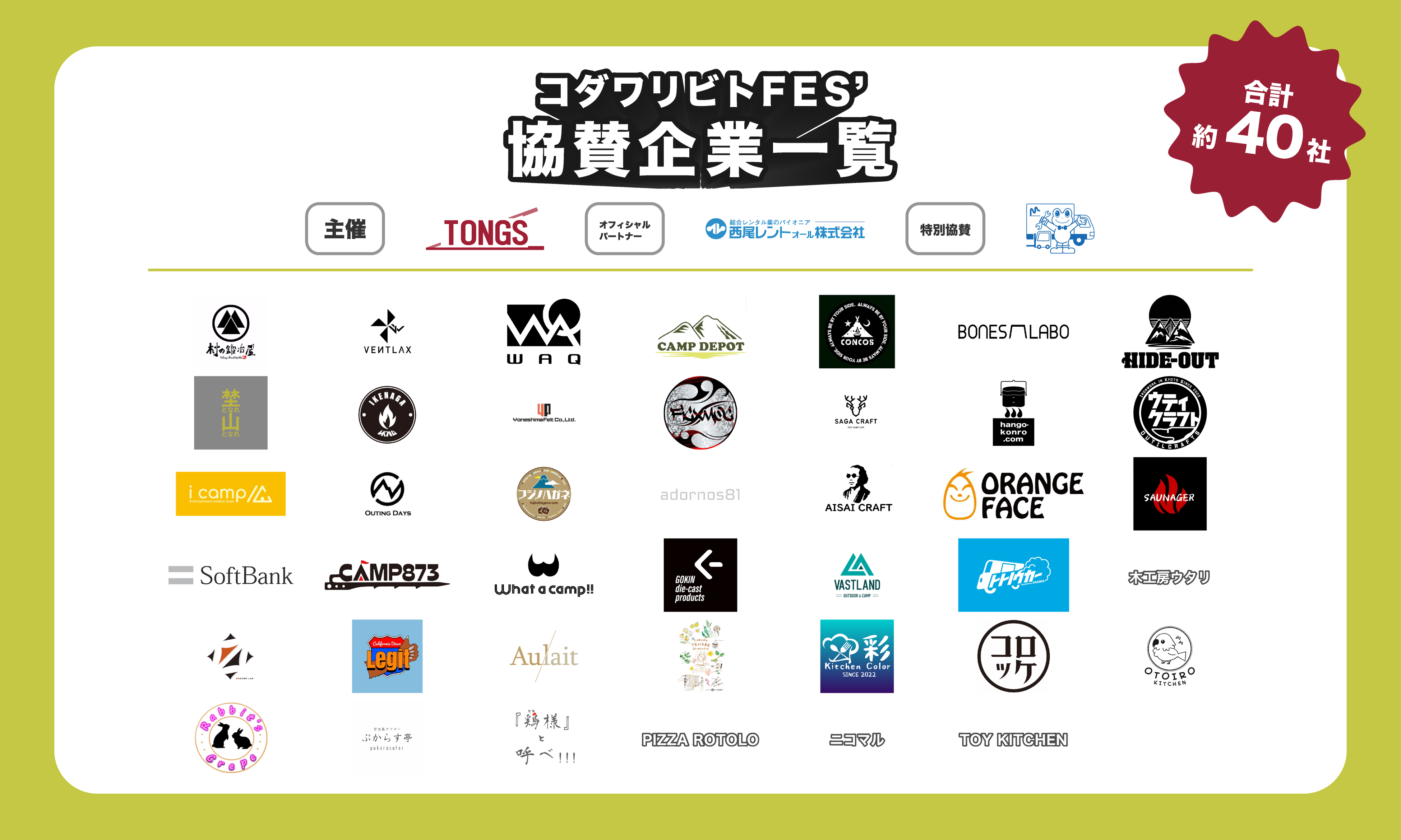 出展ブランド:WAQ、村の鍛冶屋、VENTLAX、埜となれ山となれ、HIDE-OUT、CAMP DEPOT、concos、OUTING DAYS.N.K、ハンゴーコンロ研究所、フジノハガネ、SAGA craft、Outil Craft、AISAI CRAFT、BONES-LABO、米島フエルト、池永鉄工、FicxMoc、adornos81、Saunager、ソフトバンク株式会社、木工房ウタリ、What a camp!!、Gokin diecast products、icamp、ORANGE FACE、CAMP873、VASTLAND、トトノウカー、古殿研究所、西尾レントオール株式会社
