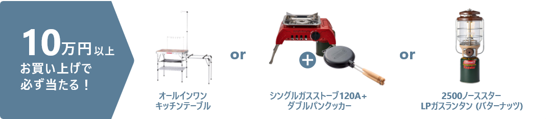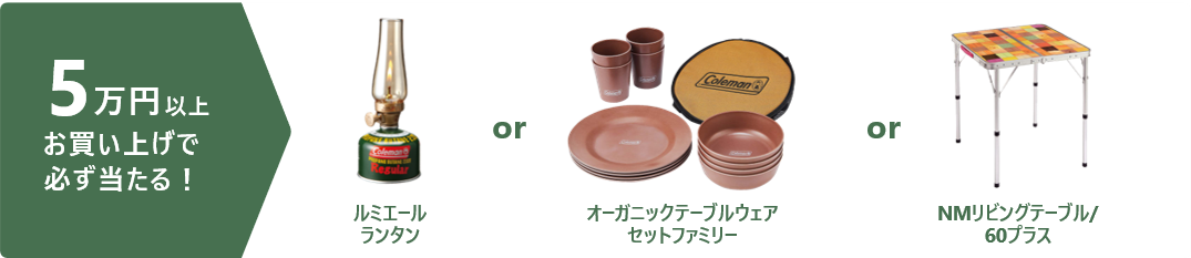 店舗またはコールマンオンラインショップで、対象商品を含む5万円以上ご購入で人気商品が必ず当たる抽選会を実施します。