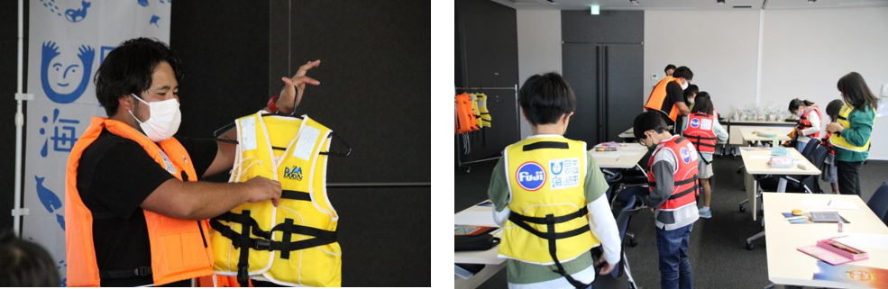 子どもたちからは、「ライフジャケットを着るなど対策をすることによって助かりやすくなることを知った」「身体の大きさに合うライフジャケットを着ることが大切だとわかった」「ライフジャケットには助けを呼ぶため笛がついていることをはじめて知った」「溺れている人を助けるときにはペットボトルなど浮くものを投げるということを知った」「海や川で遊ぶときは陸上で遊ぶとき以上に天気を確認して、潮汐なども見ることが大事」などの感想が寄せられました。