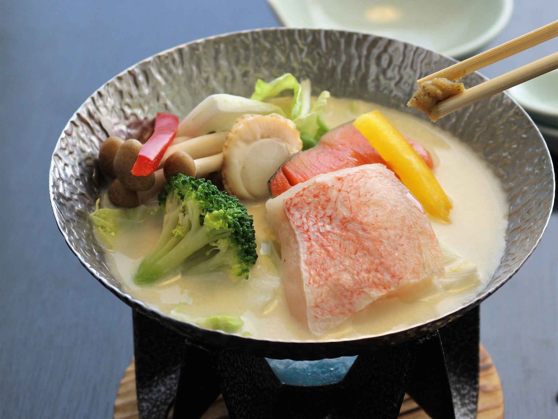 台の物 白良鍋(魚介、野菜)生七味を添えて