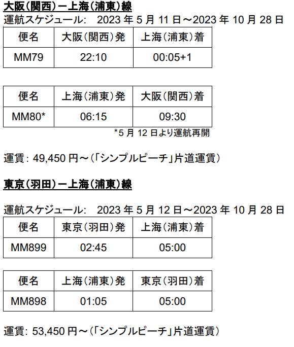 · 2023 年 5 月 11 日より大阪(関西)-上海(浦東)線、5 月 12 日より東京(羽田)-上海(浦東)線を再開