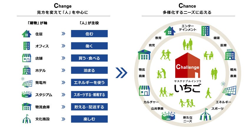 私たちは、「サステナブルインフラ」という新しい事業活動を通じ、日本の皆さまに経済的な豊かさと心の豊かさを提供することを願っています。サステナブルインフラは、今ある不動産に新たな価値を創造するいちごが、さらに不動産を超えて、不動産というリアルな拠点をハブとして、生活インフラとしての新たな価値を提供する事業です。不動産と、観光、農業、エンターテインメントといった様々なコンテンツをつなぎ、不動産を人々の生活に欠かせない「サステナブルインフラ」として、地域社会の課題解決に取り組みながら、人々の豊かな暮らしを実現してまいります。