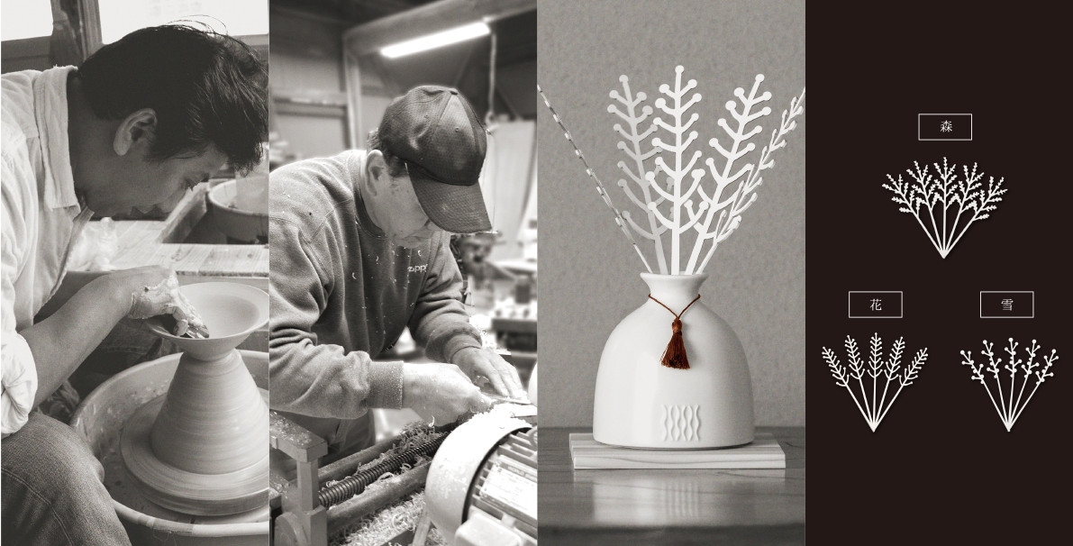 徳利をモチーフにしたオリジナルデザインの器の作陶を有田「李荘窯」に、コースターは日本固有種である吉野杉を採用、そして正絹のタッセルは京都の工芸職人による職人技が光る逸品であり、四季の草木をデフォルメして表現したオリジナルデザインのリードスティックは特殊な日本製の厚紙です。