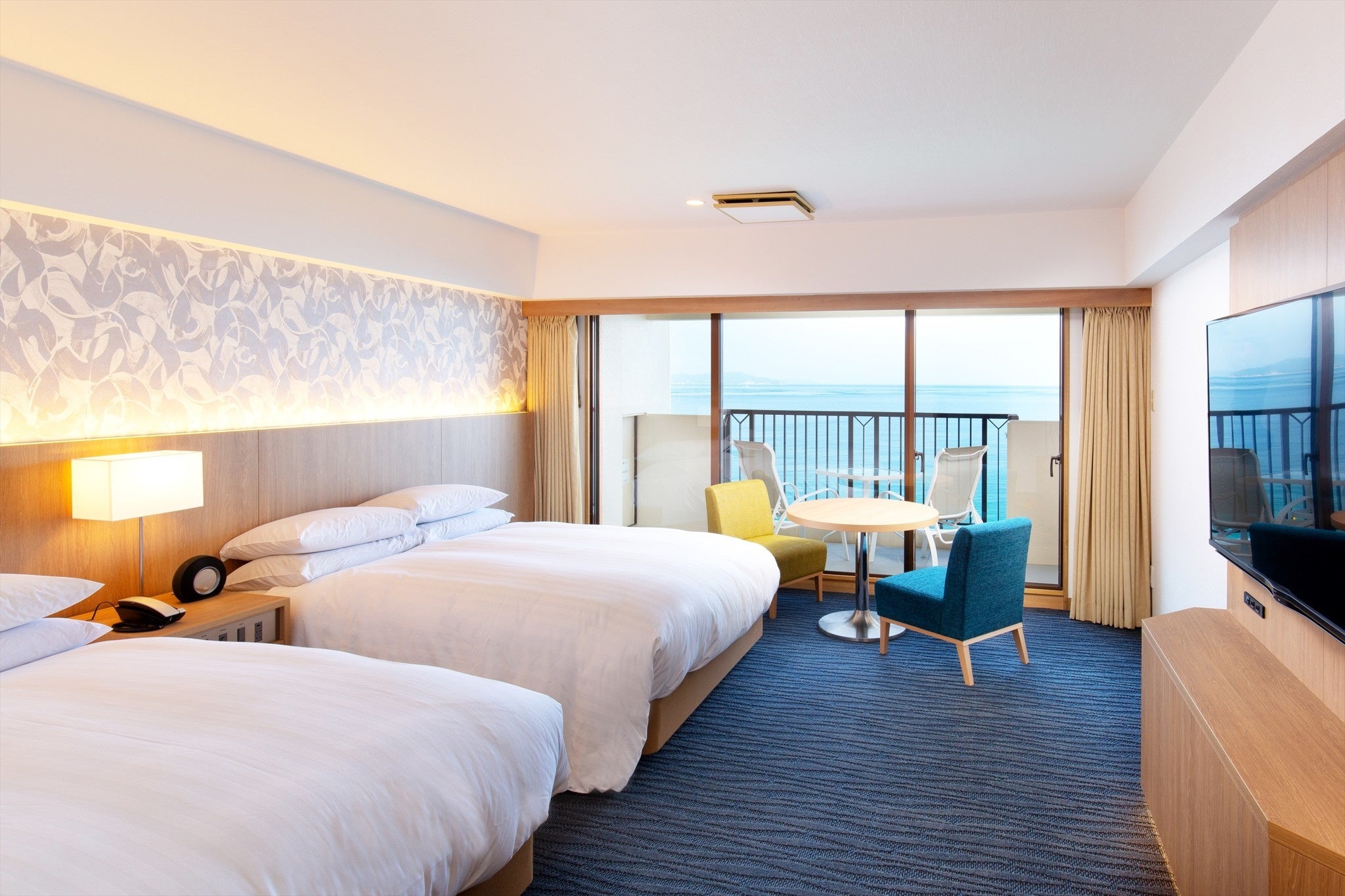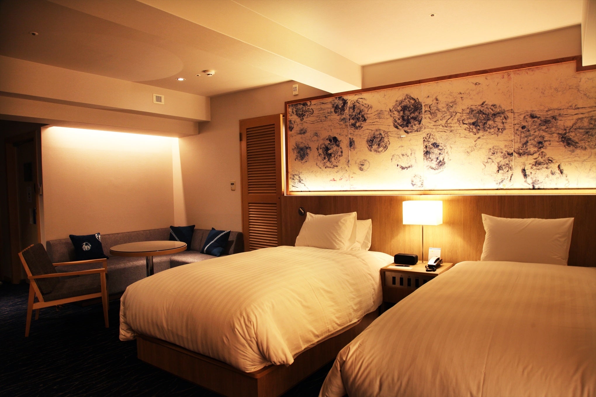 ベッドから海を見晴らせる洋室、徳島の匠による阿波藍ルームなど旅のスタイルで選べる客室は 15 タ イプ。