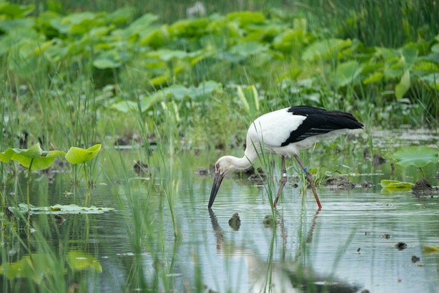 2015 年 2 月頃、コウノトリ雌雄各1羽が舞い降りたのは、吉野川の下流の鳴門 市大麻地区。潤沢な水と、きめの細かい土壌を活かしたレンコン栽培が盛んです。