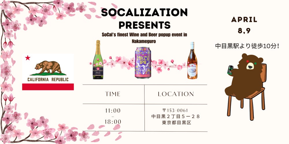 フードカルチャーを通じて “SOCAL”(ソーキャル=南カリフォルニア) のリラックスしたライフスタイルを提案するソーキャリゼイション株式会社 (以下、ソーキャリゼイション/本社:東京都目黒区、代表取締役:白神 襲之) は、2023年4月8日と9日(土日)、中目黒は目黒川沿いのスペースにて、桜のもとで南カリフォルニア産のワインやクラフトビールなどのお酒が楽しめるイベントを開催します。このイベントは同社がミッションとしている「一度きりの人生、楽しく生きる”SOCAL(ソーキャル)=南カリフォルニア” ライフスタイル」啓もう活動の一環として行うものです。来場者にはSOCALライフスタイルを日々実践することをイベント後も思い出せるように、同社のマスコット「ソーキャルモン」のオリジナルステッカーが配られます。