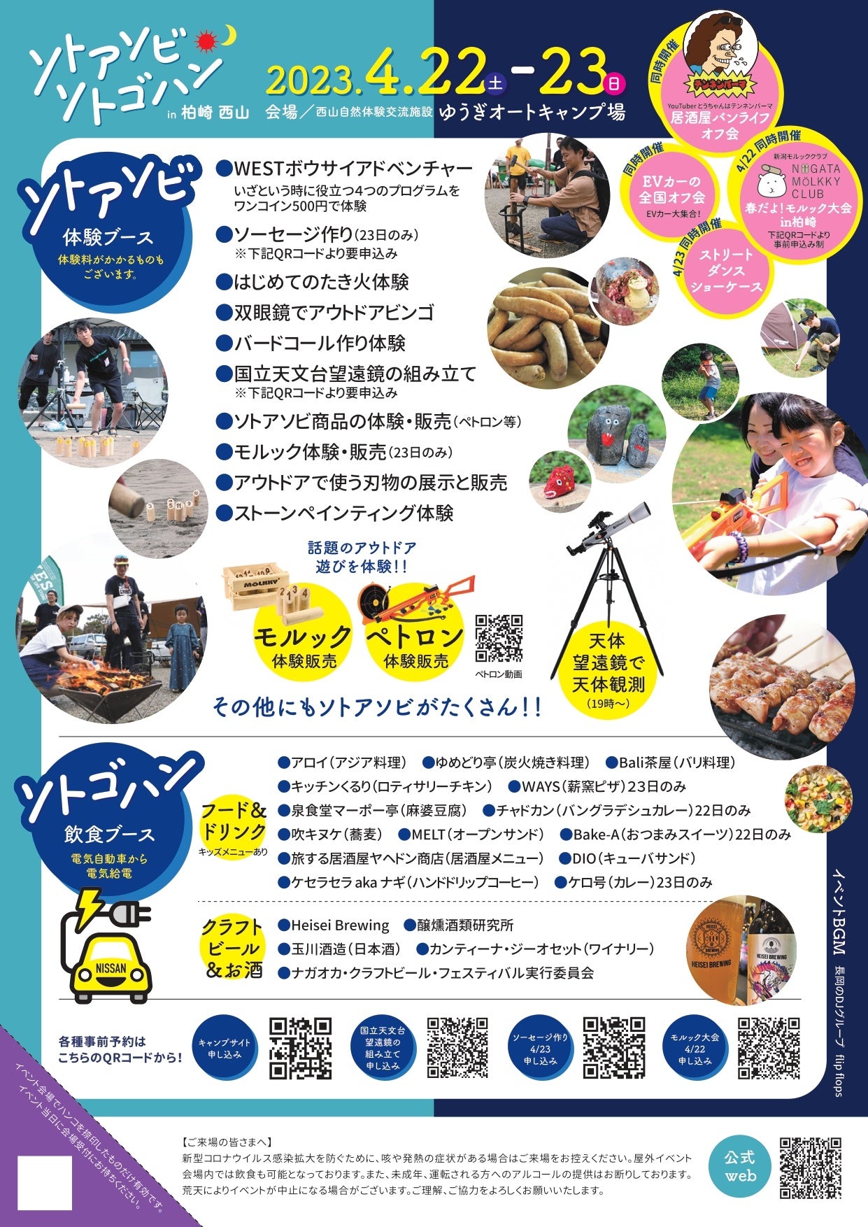 キャンプが全国的にブームとなっています。長岡、上越及び南魚沼地域振興局では、自然豊かなアウトドアフィールドを活かし、「キャンプといえば、やっぱ新潟でしょ!」と言われることを目標に、 アウトドアの魅力を県内外にアピールする「にいがたキャンプ市場活性化プロジェクト」を連携して進めています。 このたび、長岡地域振興局が企画・運営で協力する「ソトアソビ ソトゴハン in 柏崎市西山」を下記のとおり開催します。 2023 年のキャンプシーズンの始まりに、新潟県民が、身近な自然で遊び、気軽に楽しむ姿を発信することで、新潟のアウトドアシーンを盛り上げていきます。 多くの皆様に参加していただきますよう、よろしくお願いします。