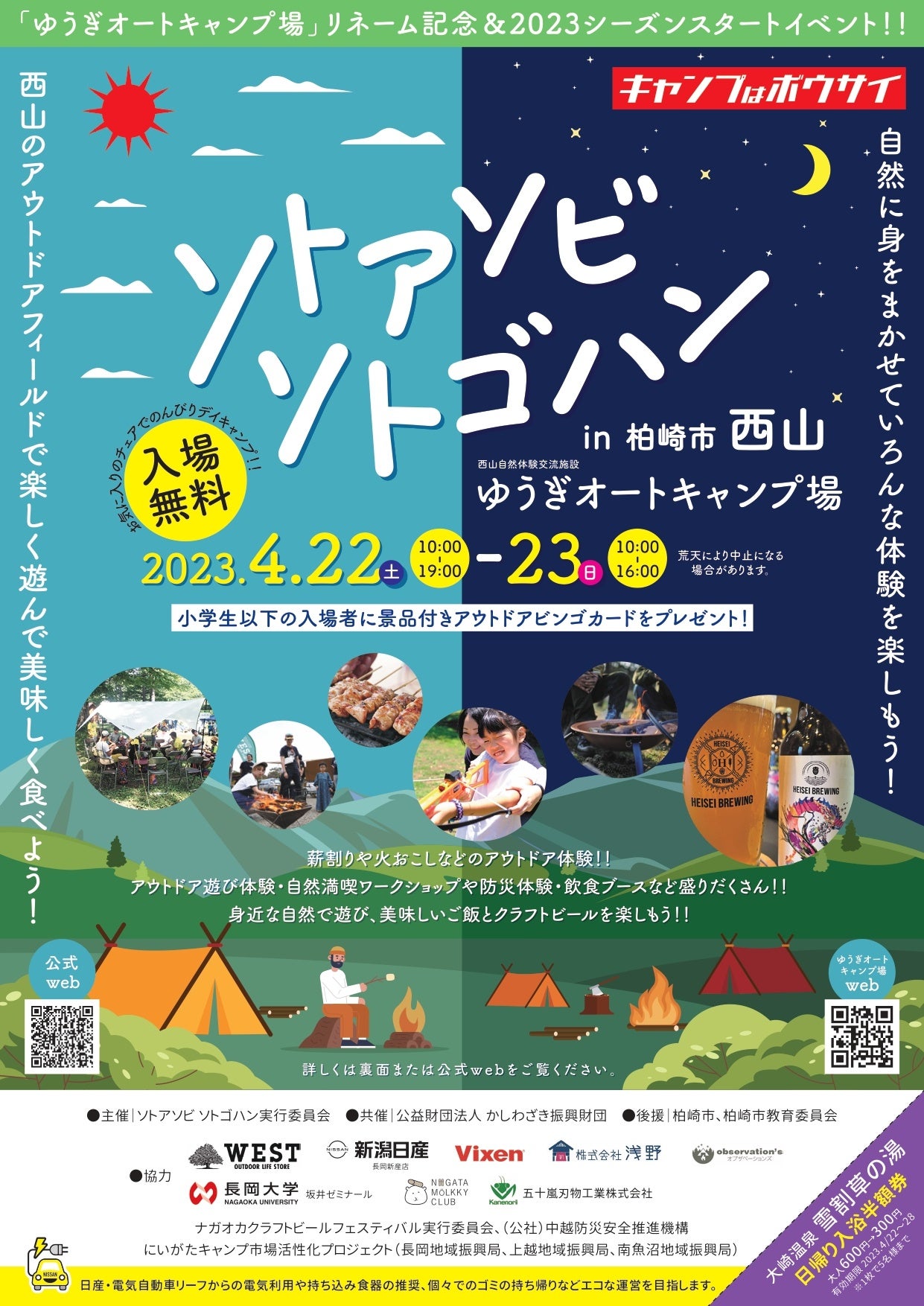 昨年秋に長岡市東山で開催したアウトドアイベ ント「ソトアソビソトゴハン」を今年の春は柏崎市で開催します! 美しく整備された「ゆうぎオートキャンプ場」を会場に、お子様、子ども連れや女性、アウトドア未経験者でも気軽に、アウトドア体験と飲食を楽しめる内容となっています。 また、「キャンプはボウサイ」を合言葉に、キャンプが災害時の備えになることを多くの人に広めていきます。ゆうぎオートキャンプ場で皆様のお越しをお待ちしています!