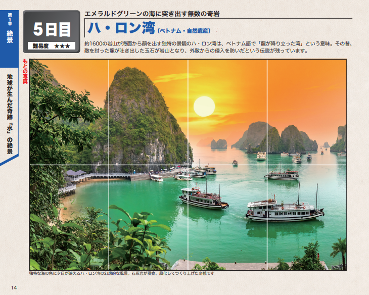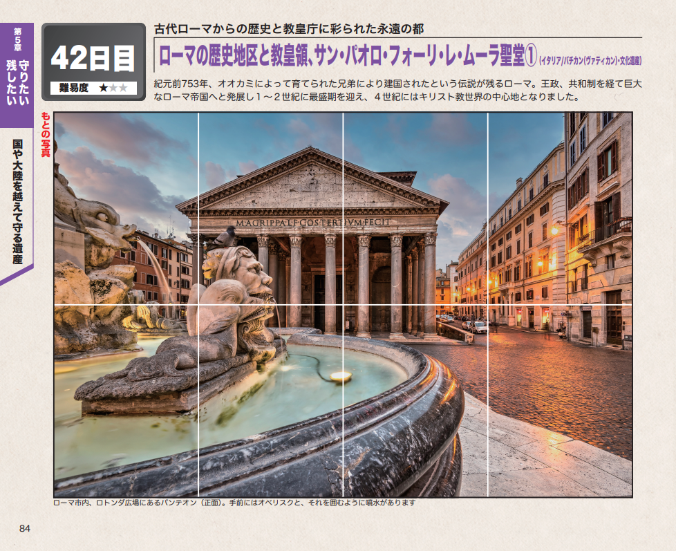 本書では、世界各地の世界遺産の美しい写真による間違い探しを掲載しています。イラストとは違い、写真の場合は細部に至るまで奥行きと広がりを持って再現されているので、ディテールに思わず見入ってしまうこともあるでしょう。眺めているだけで楽しい、それが写真による間違い探しの魅力のひとつです。