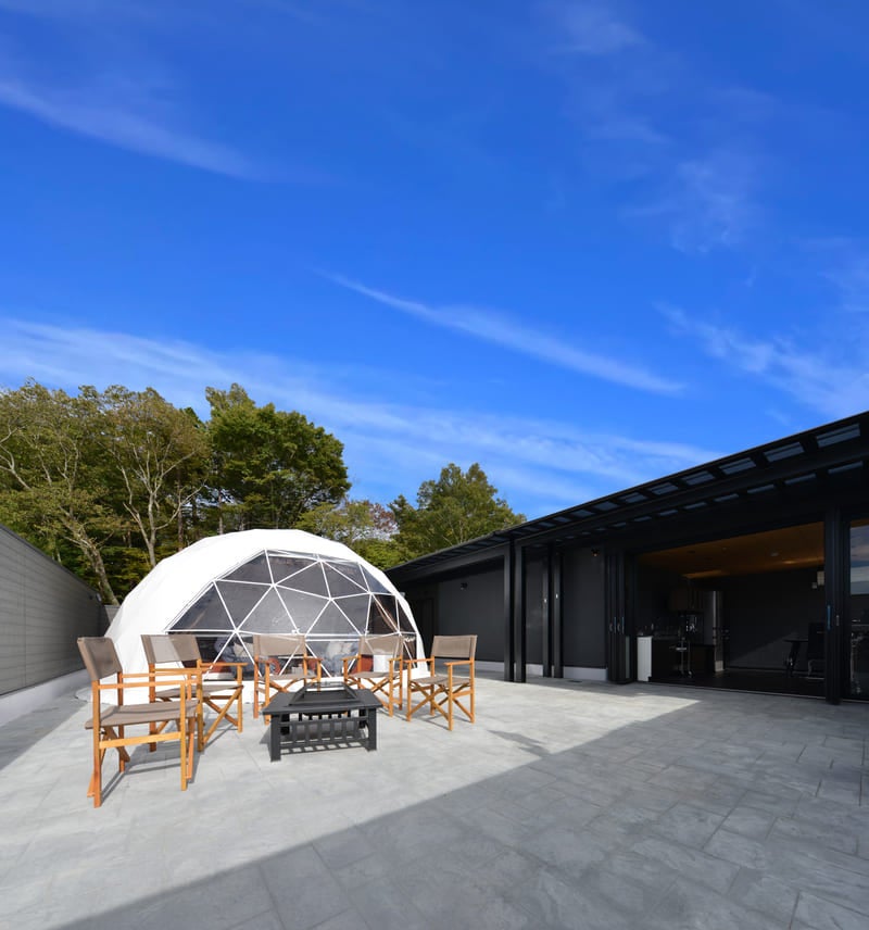 各室をそれぞれ敷居で囲い、プライベート性を重視したスペースの中に独立型のドーム型テントとハウス、露天風呂、テントサウナ、富士山の天然水を使用した水風呂を各室に設置。