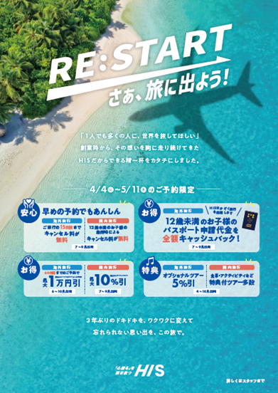 株式会社エイチ・アイ・エス(本社:東京都港区 以下、HIS)は、2023年4月4日(火)~5月11日(木)の期間で「RE:STARTさぁ、旅に出よう!」キャンペーンを実施します。期間中、対象商品のお申込みで、お子様のパスポート取得費用のサポートや、取消料発生期日の緩和など、様々な特典をご用意しました。