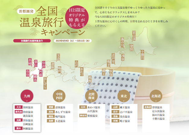 また、期間中、「全国温泉旅行キャンペーン」も併催いたします。全国選りすぐりの人気温泉地でHIS限定の夕食プランや滞在プラン、貸切風呂の事前予約など、HISのオリジナル特典をご用意しました。
