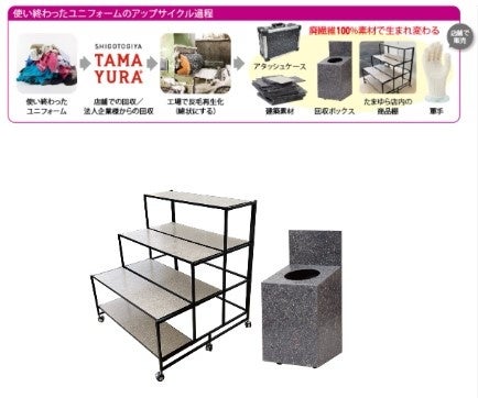 今や企業必須の取り組みであると言っても過言ではありません。たまゆらアスレでも不要なユニフォーム(衣類)を回収してできたサステナブルな什器を導入したり、そのユニフォーム回収BOX自体もサステナブル素材で作成する等、積極的に取り組んでいます。回収した衣類は加工工場において綿に変え、様々な加工を施すことによって、軍手や店舗の一部資材や什器の棚板、アタッシュケース、自動車の内装材などの新しい製品へアップサイクル・再生いたします。