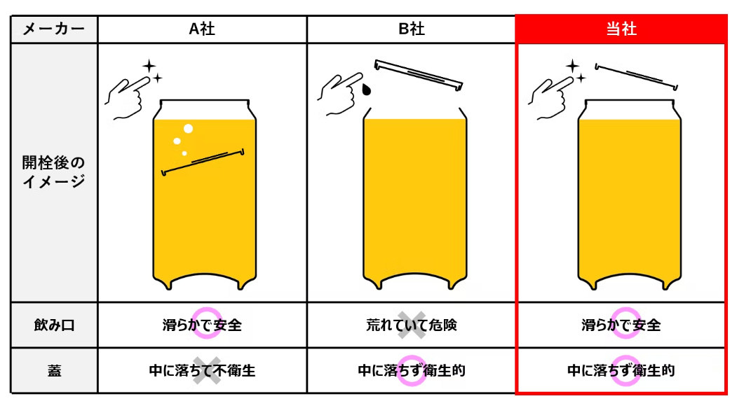 缶ビール用の缶オープナーはこれまでにもありましたが、「飲み口が荒れていて危険」「蓋が中に落ちて不衛生」である点が課題であり普及に至っていませんでした。一方でDAVIは既存製品に無い「4つの強み」を持っており、これらの課題をスマートに解決しています。