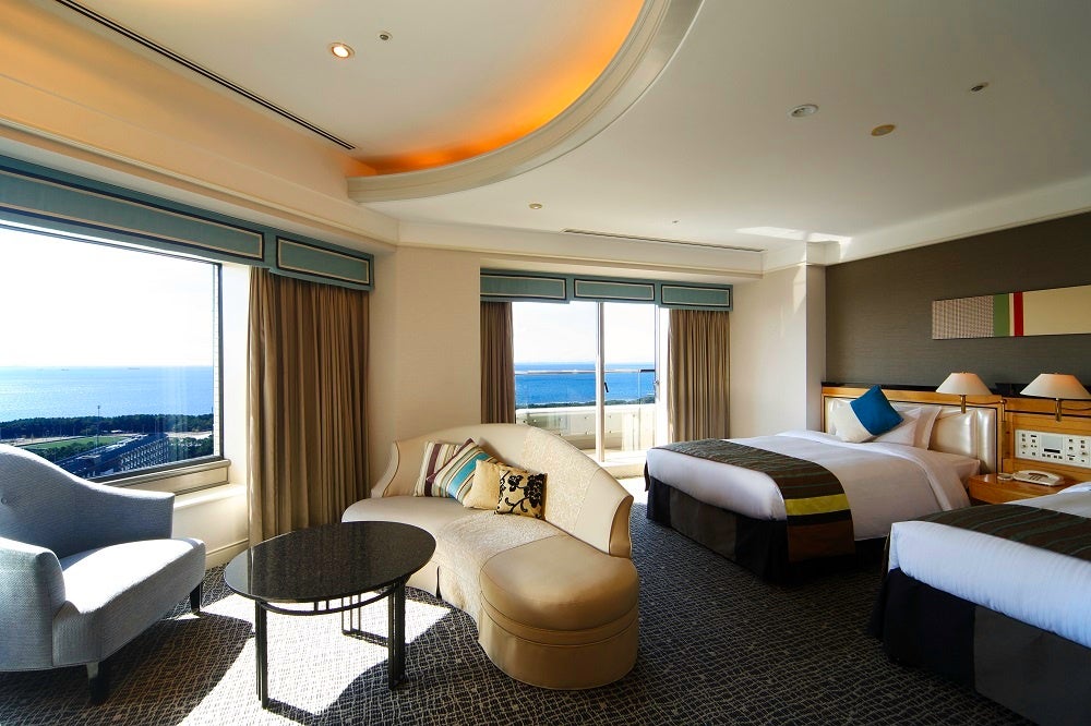 本プランではバルコニーに出て風を感じることができる優雅でスタイリッシュな「バルコニースイート(64平米)」をご用意いたします。カーテンを開ければ東京湾を一望することが可能です。夕方には、お天気次第で東京湾の対岸に沈むサンセットや夕陽に染まる空の幻想的な眺めもお愉しみいただけます。