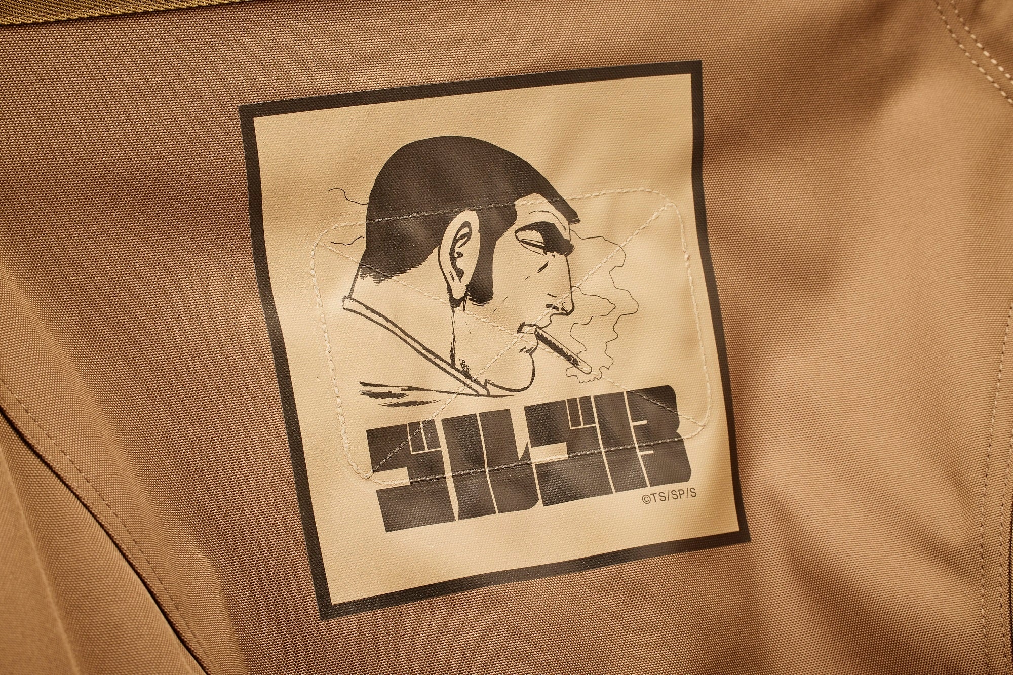 背面の内側には、デューク東郷のイラストをプリント。外側には、おなじみの名セリフ「俺の後ろに立つな……」のパッチを付けています。