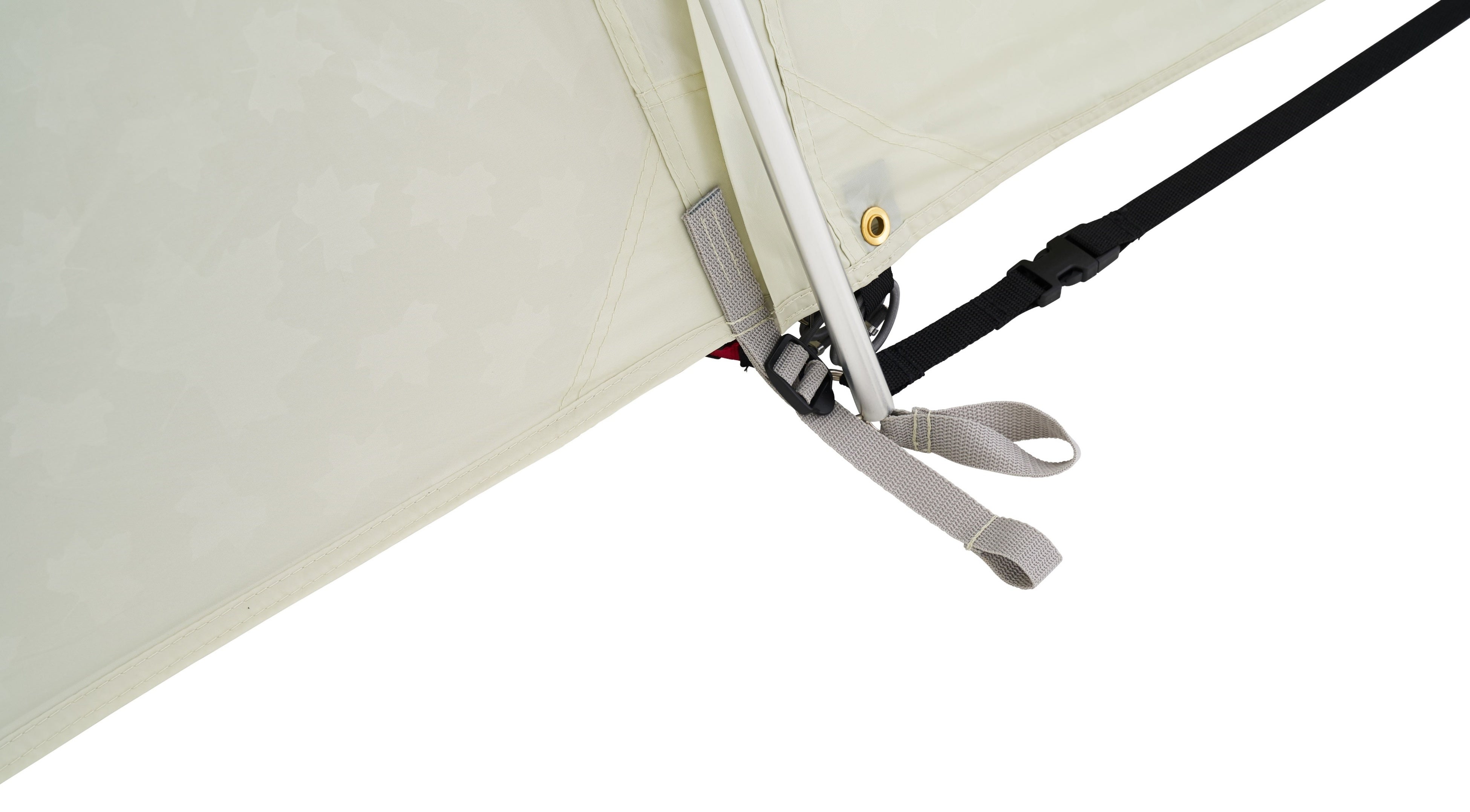 LOGOS独自のSUPPORT BELT SYSTEMを採用。フレームをリングピンに差し込む部分に調節可能なベルトを設けることで、設営時にはベルトを緩めると簡単にフレームを差し込むことができ、差し込んだ後はベルトを短く締めると簡単かつ余分な力いらずでテントを張ることができる。