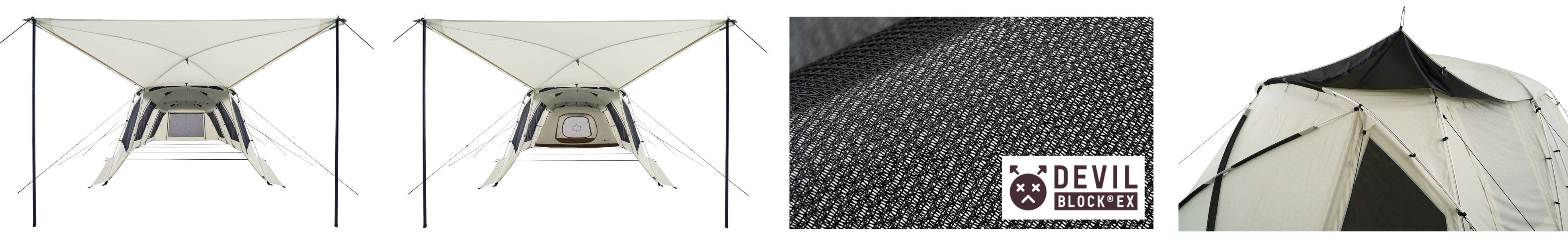 インナーテントは着脱可能。フライシート単独では大型のスクリーンタープとして使用できる。メッシュ窓には、LOGOSが独自に開発した高機能メッシュ「デビルブロックEX」を採用しており、風を通しながら紫外線や虫の侵入を防止。トップシートにはUV-CUT率99.9%以上、遮光率100%(※1)のソーラーブロック加工を施し、日向と日陰で-15℃の温度差(※2)を実現。