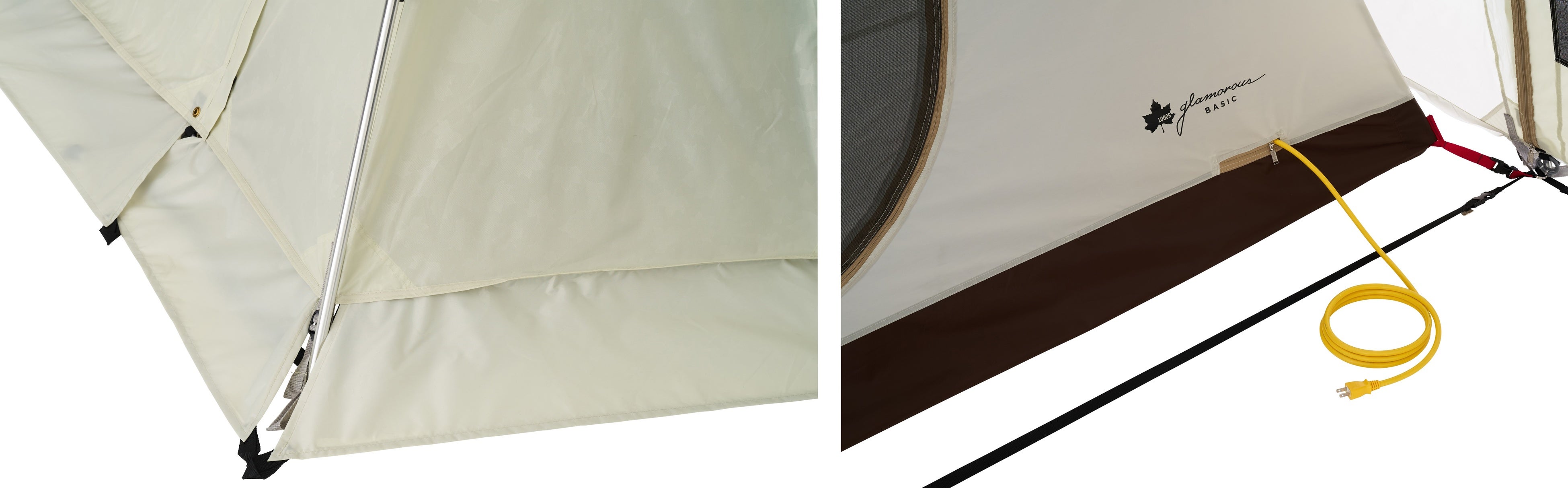 冷気や雨、虫の侵入を防ぐマッドスカートを全面に装備。ペグが打てるループが付いているので風のバタつきも防げる。インナーテント下部には、ジッパーが付きで冷気を遮断できる電源コードの取り込み口も完備。