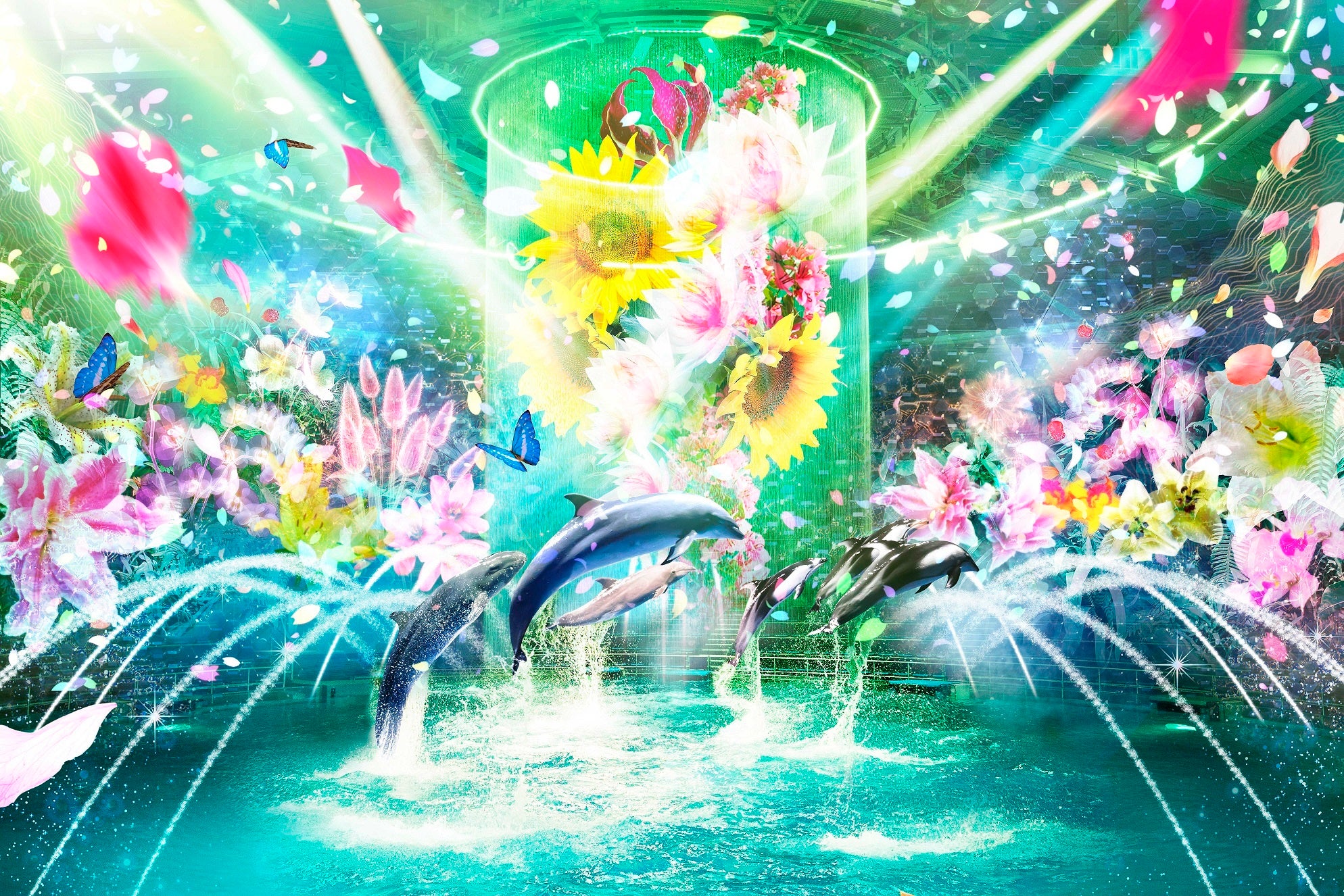 光・花・水のアートとイルカたちがお届けする、喜びあふれるひととき。