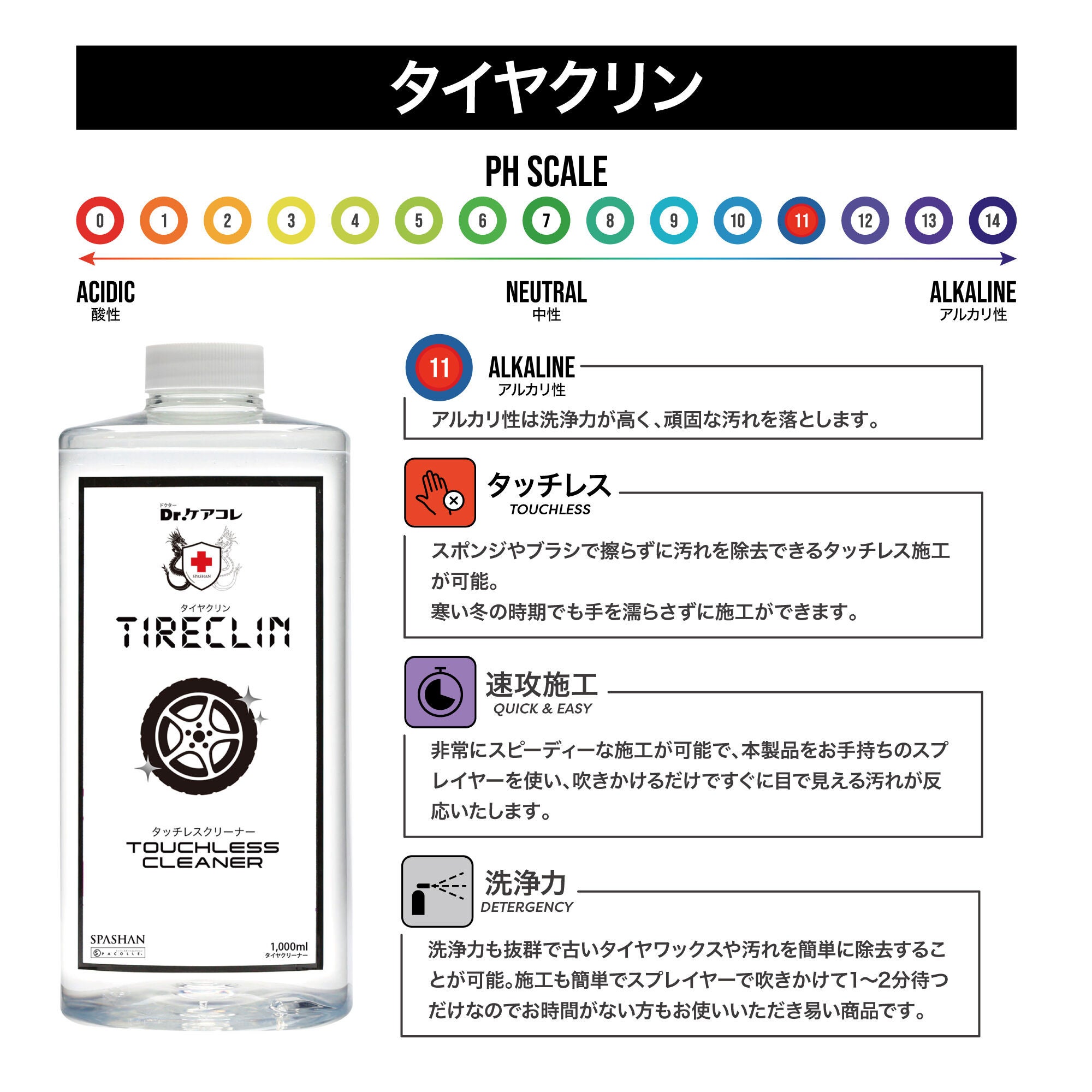 タイヤクリンはスポンジやブラシを使うことなくタイヤに付着した汚れを簡単に除去できるタッチレス施工可能な洗車溶剤です