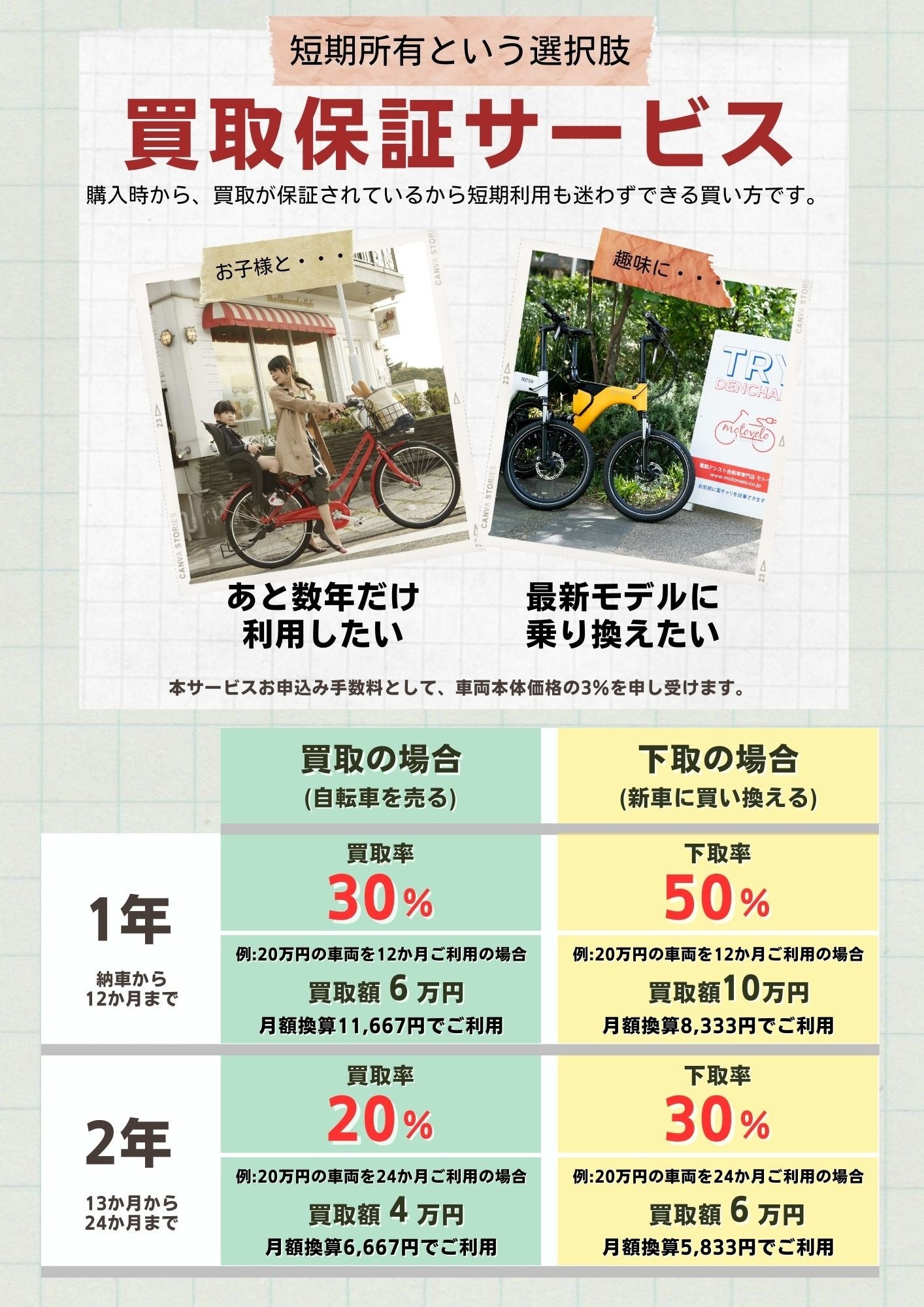 そのような中でも自転車は日常生活に欠かせない移動手段であり、これまで以上にお客様がご購入頂きやすいプランのご提案となります。(サービス利用料は車両本体価格の3%を申し受けます)