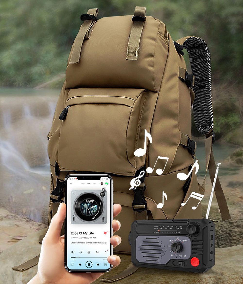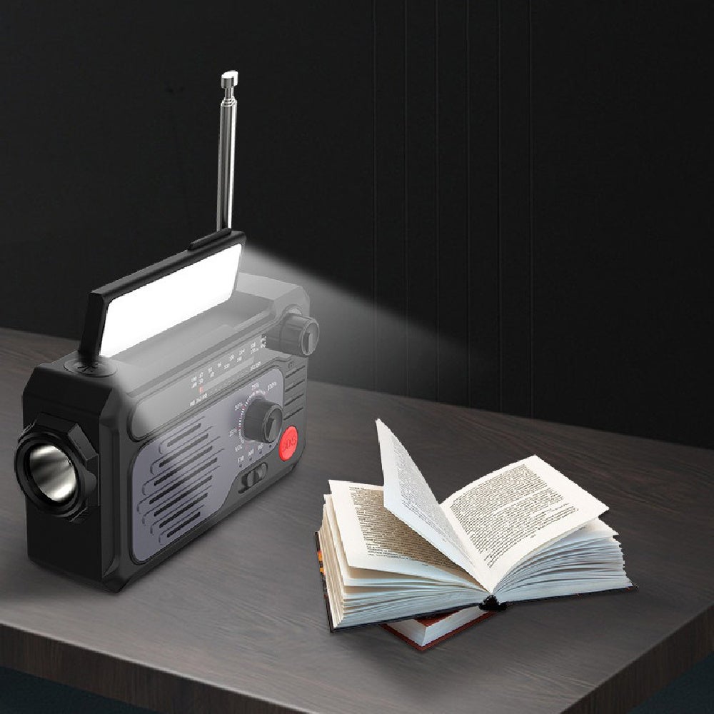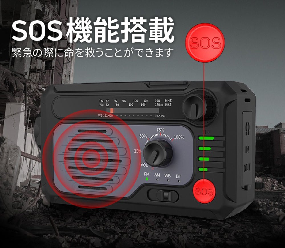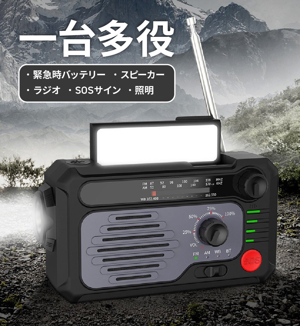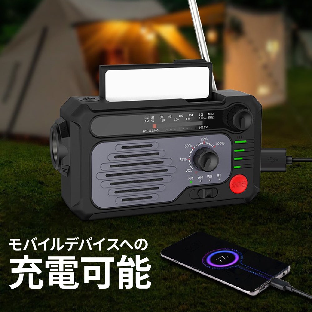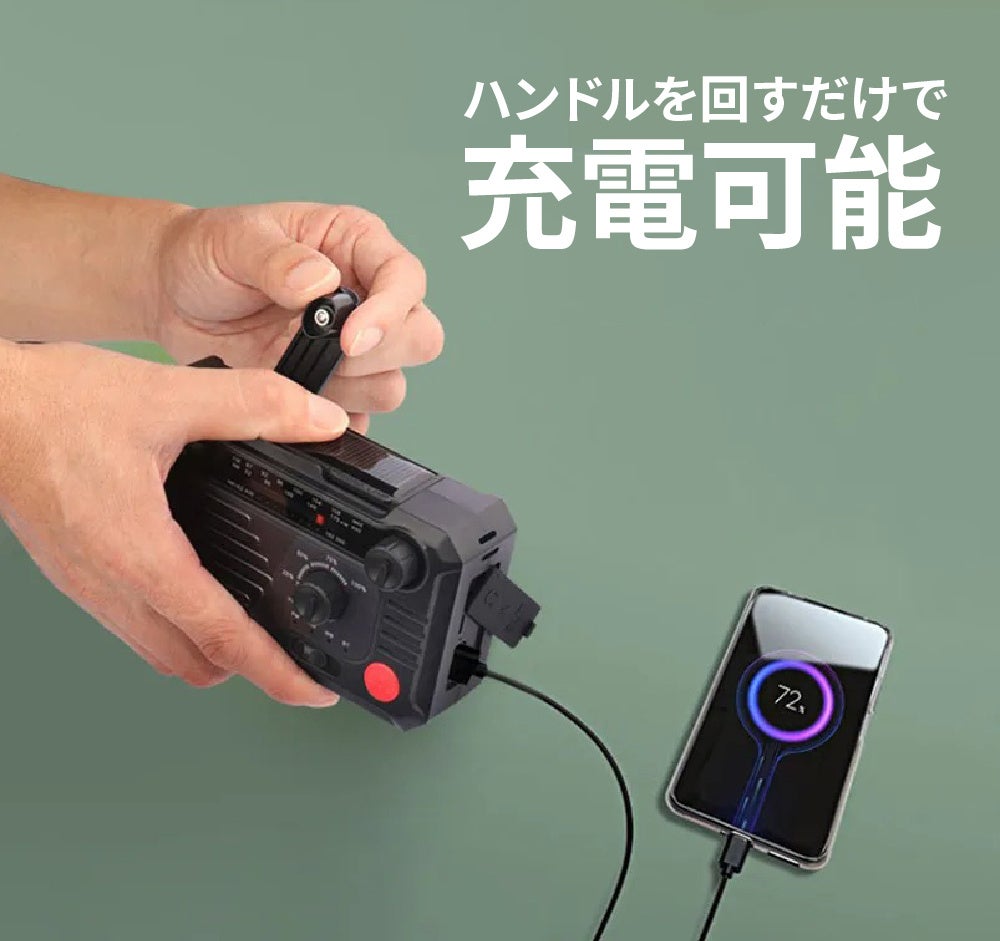 - ソーラーパネル+手回し発電で電源がない場所でも使用可能