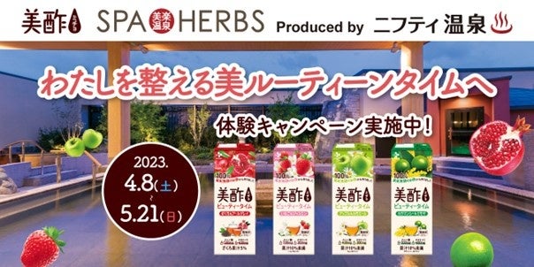 今回、100%果実発酵酢から作った、美しい毎日をおくりたい方に向けたお酢「美酢」による 「#美酢活で美ルーティーン」というキャンペーンの展開に合わせて、ニフティ温泉が毎年実施している年間ランキングにて、3年連続で全国1位に輝いた「美楽温泉 SPA-HERBS」とのコラボレーション企画を開催。美酢オリジナル入浴剤を使用したコラボ湯のほか、果物オイルを使用した岩盤浴やサウナ等が楽しめます。