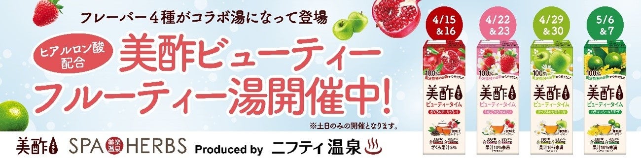 ヒアルロン酸配合、美酢の各フレーバーをイメージしたフルーティーな香りが楽しめるコラボ湯を体験できます。また入浴スタンプラリーも実施!週ごとに替わる全4種のフレーバー湯をすべて体験した方には、もれなく美酢ビューティータイム ざくろ&アールグレイ(500mL)をプレゼントします。