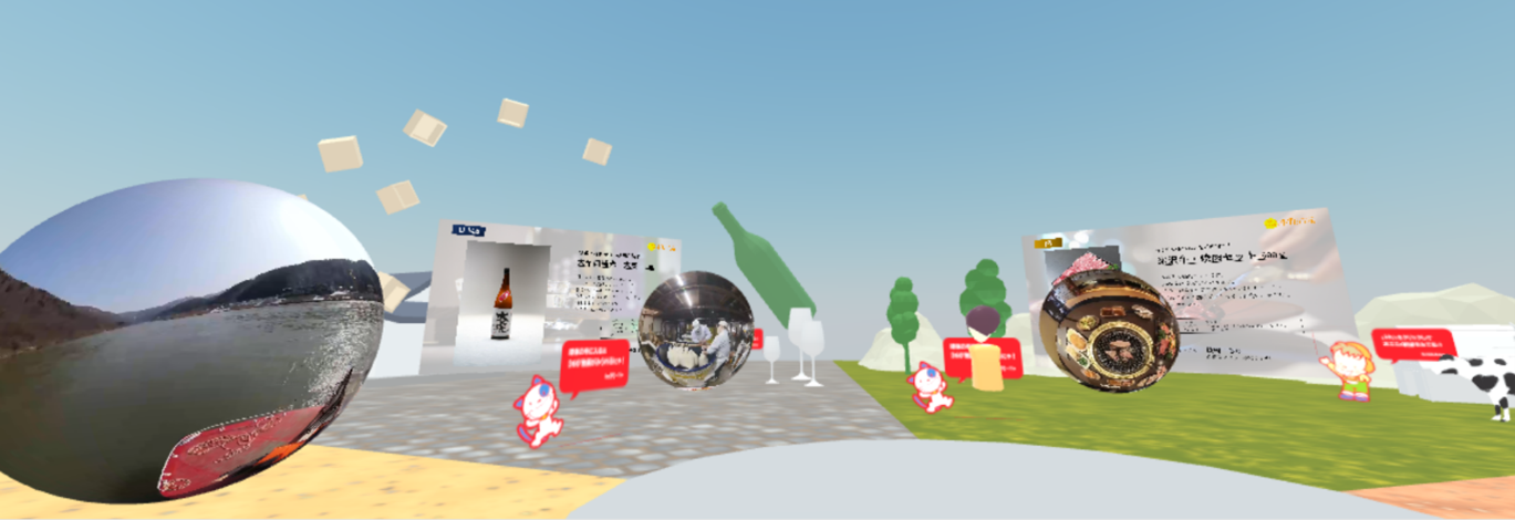 VRゴーグルを利用した仮想空間内で、全国の新聞社が地方の名産を紹介するサイトと連携した山形県内の名産品の生産工程等を紹介するイメージ動画やパネルによる取扱店情報に加え、山形の代表的な観光地の動画等を体験できるデジタルコンテンツを提供いたします。仮想空間内で紹介している動画は全て360度動画となっています。今後も季節に応じてさまざまなコンテンツを提供していく予定です。