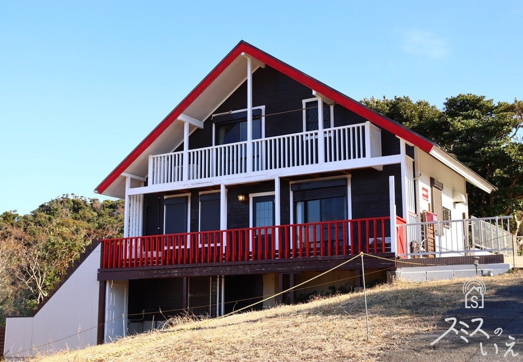 見物海岸や波左間海水浴場から車で5分。小高い丘の上にある黒に映える白と名前の由来ともなった赤のコントラストが目を引く外観。