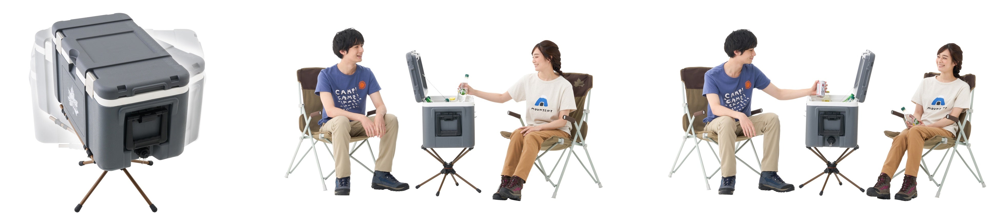 スタンドが回転することで、コンテナやクーラーボックスの中身がどの方向からでも取り出せる「回るんスタンド」を、アウトドアライフでぜひともご活用ください。