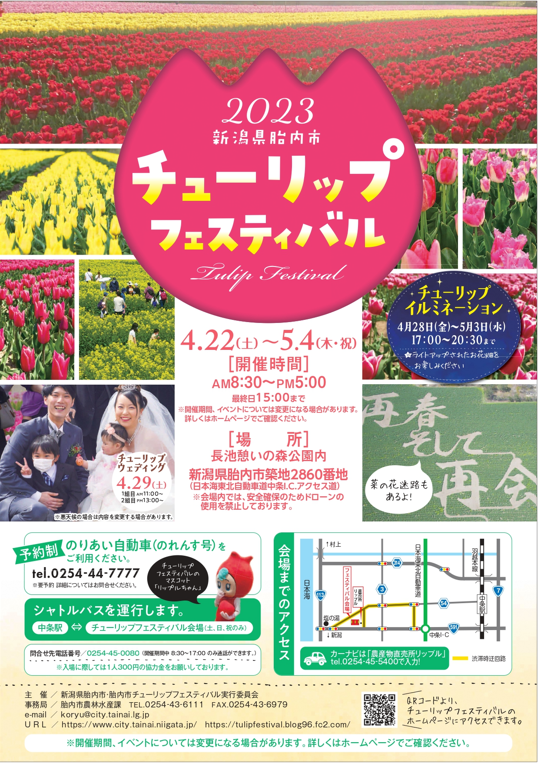 会場には、胎内市内の飲食・菓子店が出店する飲食ブースも設置され、「胎内の味」も楽しめます。ほか、高所作業車乗車体験(有料)、チューリップ写真コンテスト、チューリップウエディングなど、イベントが盛りだくさん!最終日にはチューリップの花を一気に刈り取る作業も見学できます。