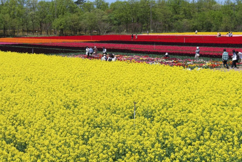 「胎内市チューリップフェスティバル」では、約60種類、80万本ものチューリップが2hの畑に広がるほか、隣接する2hの菜の花畑では「菜の花迷路」が楽しめます。春の空のもと、一面に広がる色鮮やかな花の絨毯は圧巻です。ぜひ、花々がつくりだす大パノラマをご堪能ください。