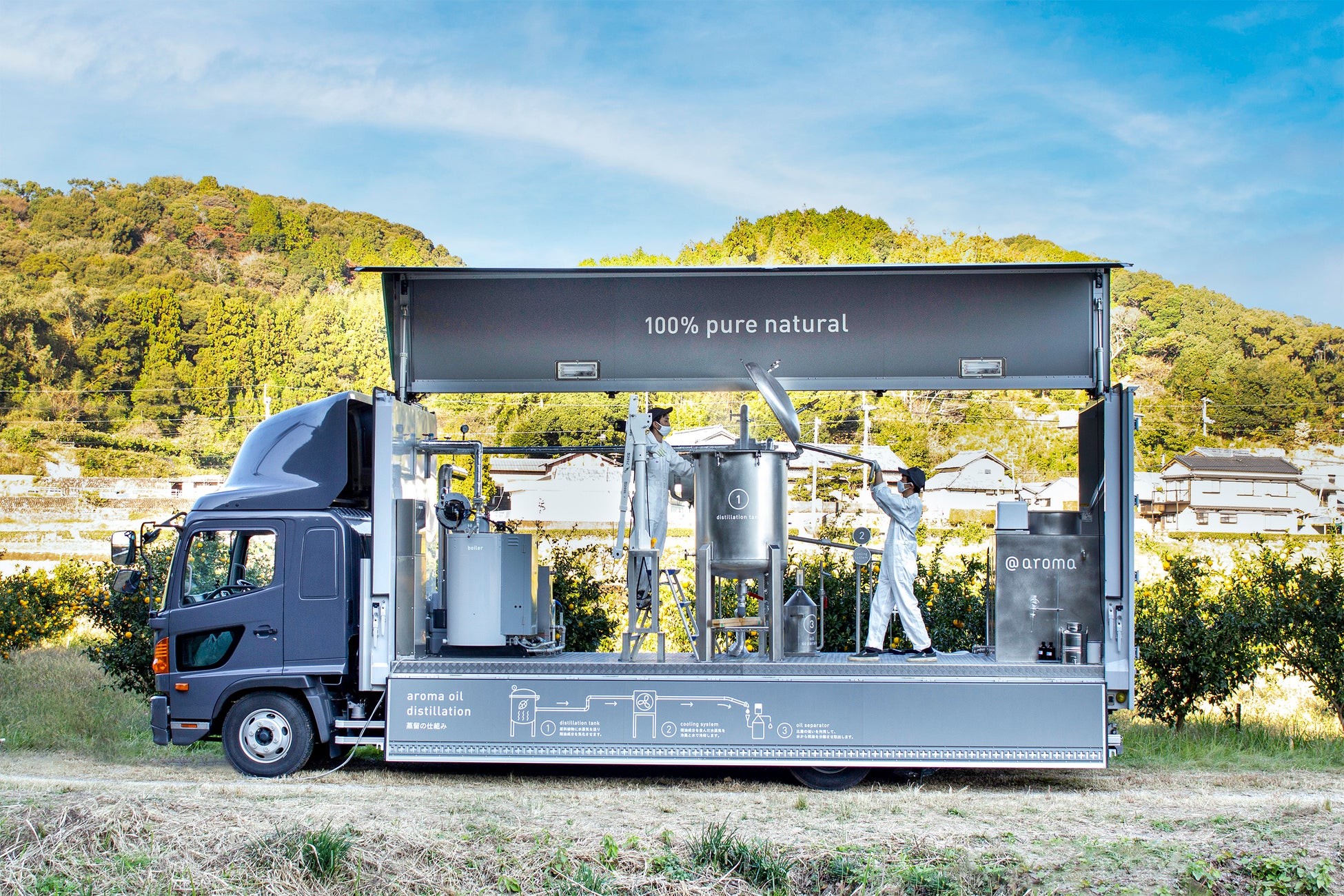 「モバイルアロマラボ」は、トラックに蒸留器を搭載した移動式蒸留装置です。エッセンシャルオイルの原料となる植物の魅力を発信することや未利用資源の活用などを目指し、日本全国の原材料の植物の産地まで赴き、精油の蒸留を行っています。これまでに、柚子・直七(高知県)、高野槙(奈良県)、三ケ日青ミカン(静岡県)、檜原村ヒノキ(東京都)などの蒸留を実施しました。