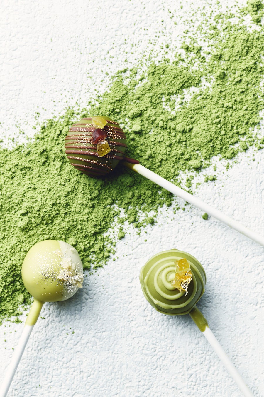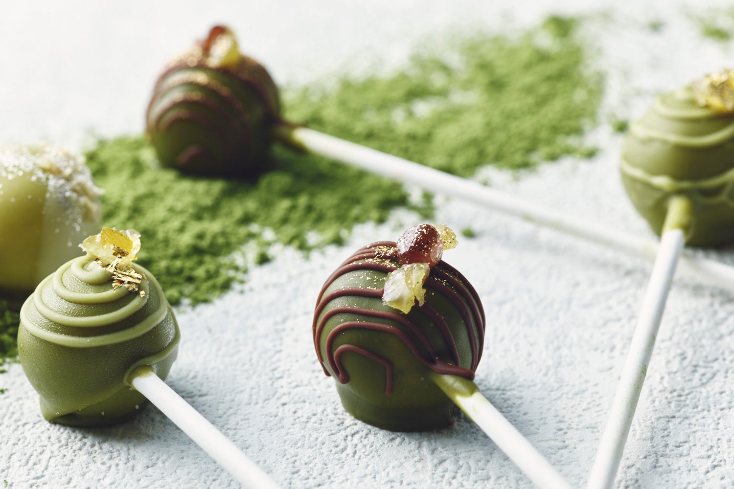 イタリアングリル「メロディア」では、エグゼクティブペストリーシェフ 長田 学による、スイーツのテイクアウト商品を販売いたします。眩い新緑の季節におススメしたい、抹茶香り立つ3種のロリポップチョコレートをご用意しました。