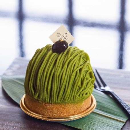 絞った抹茶クリームのフォルムが美しい和風モンブランです。ほうじ茶を練り込んだタルトに渋皮栗を入れて、黒蜜のくずまんじゅうを閉じ込めた抹茶クリームをのせました。抹茶の渋みと芳醇な香りのほうじ茶でほんのり大人なテイストに仕上げています。