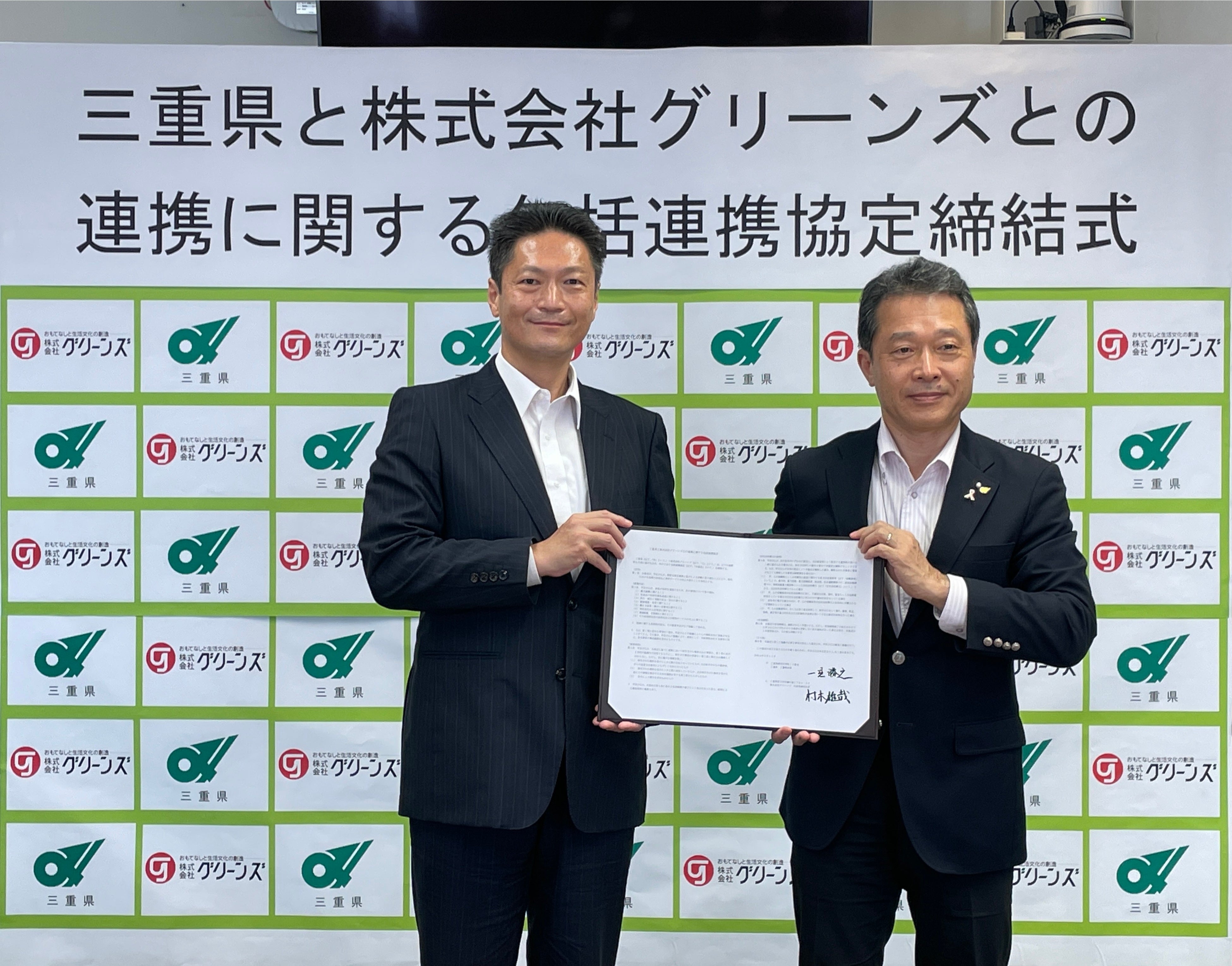 株式会社グリーンズでは、2022年8月31日、三重県と県内各地域の活性化や県民サービスの向上に向け「包括連携協定」を締結しています。「観光振興に関すること」「県産品の利用や商品造成に関すること」「防災・減災と地域の安全・安心に関すること」「健康増進・食育に関すること」「働き方改革・障がい者雇用に関すること」「将来世代の人材育成に関すること」「環境配慮、省資源化に関すること」「その他地域社会の活性化および県民サービスの向上に関すること」の8項目について三重県と連携し取り組んでいきます。