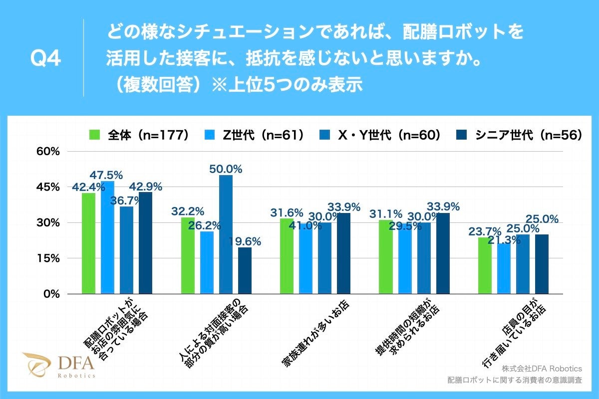 今回のアンケート調査により、配膳ロボットに「抵抗感がない」割合は、全体の45.0%が配膳ロボットに抵抗感がなく、世代別にみると、Z世代は41.4%、X・Y世代は44.1%、シニア世代は49.5%と、意外にもシニア世代が最も抵抗感がないという結果が明らかになりました。