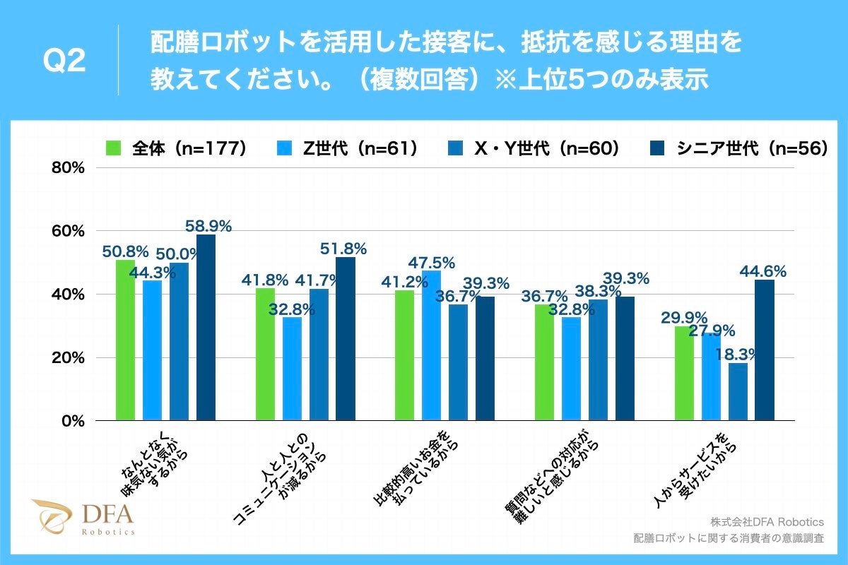 ■配膳ロボットの接客に抵抗感を感じる理由、X・Y世代、シニア世代は「なんとなく味気ない気がするから」が最多、Z世代は「比較的高いお金を払っているから」が最多の結果に