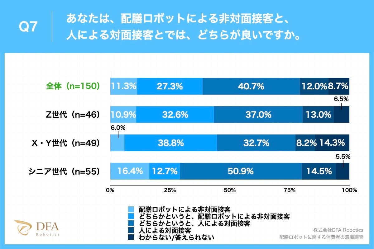 一方で、「人による対面接客」よりも「配膳ロボットによる非対面接客」が良いと回答した割合は、Z世代は43.5%、X・Y世代は44.8%、シニア世代は29.1%という結果となり、抵抗感と大きく差が出たのはシニア世代でした。このことからシニア世代においては、理解を示すものの、人による接客のほうが好ましいという考えが浮き彫りとなりました。