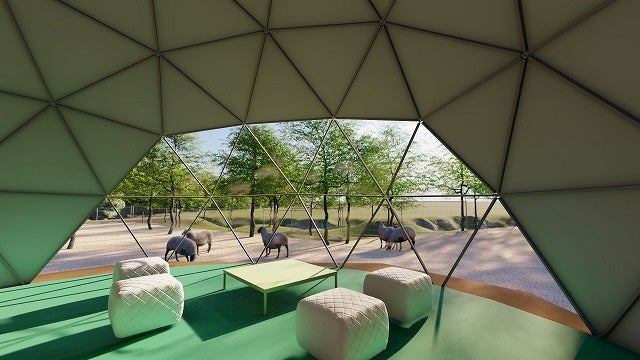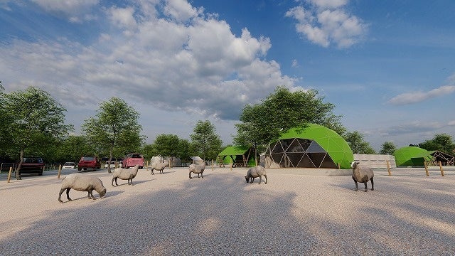 りんどう湖ファミリー牧場の入園が無料になる人気のグランピングエリアに、新たに「アルパカと一緒に過ごせるグランピング」8棟が仲間入りします。アルパカの群れの中に柵で囲まれたグランピングが存在しているため、超至近距離に近づく不思議な体験をお楽しみいただけます。夕食、朝食をアルパカにごはんをあげながら過ごしたり、朝カーテンを開けた瞬間からアルパカと目を合わせたり、日本初の経験※を、朝、昼、夜と楽しむことができます。